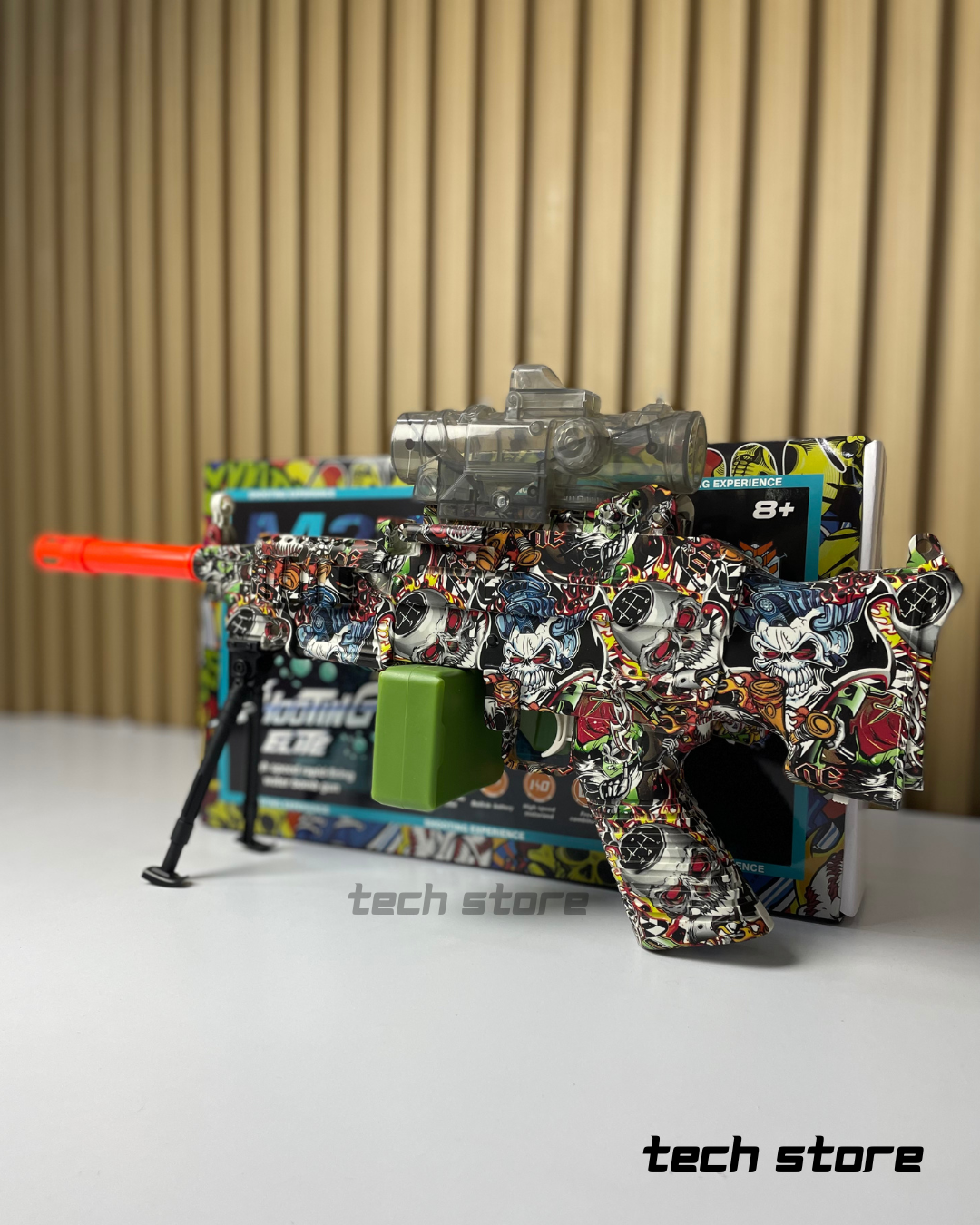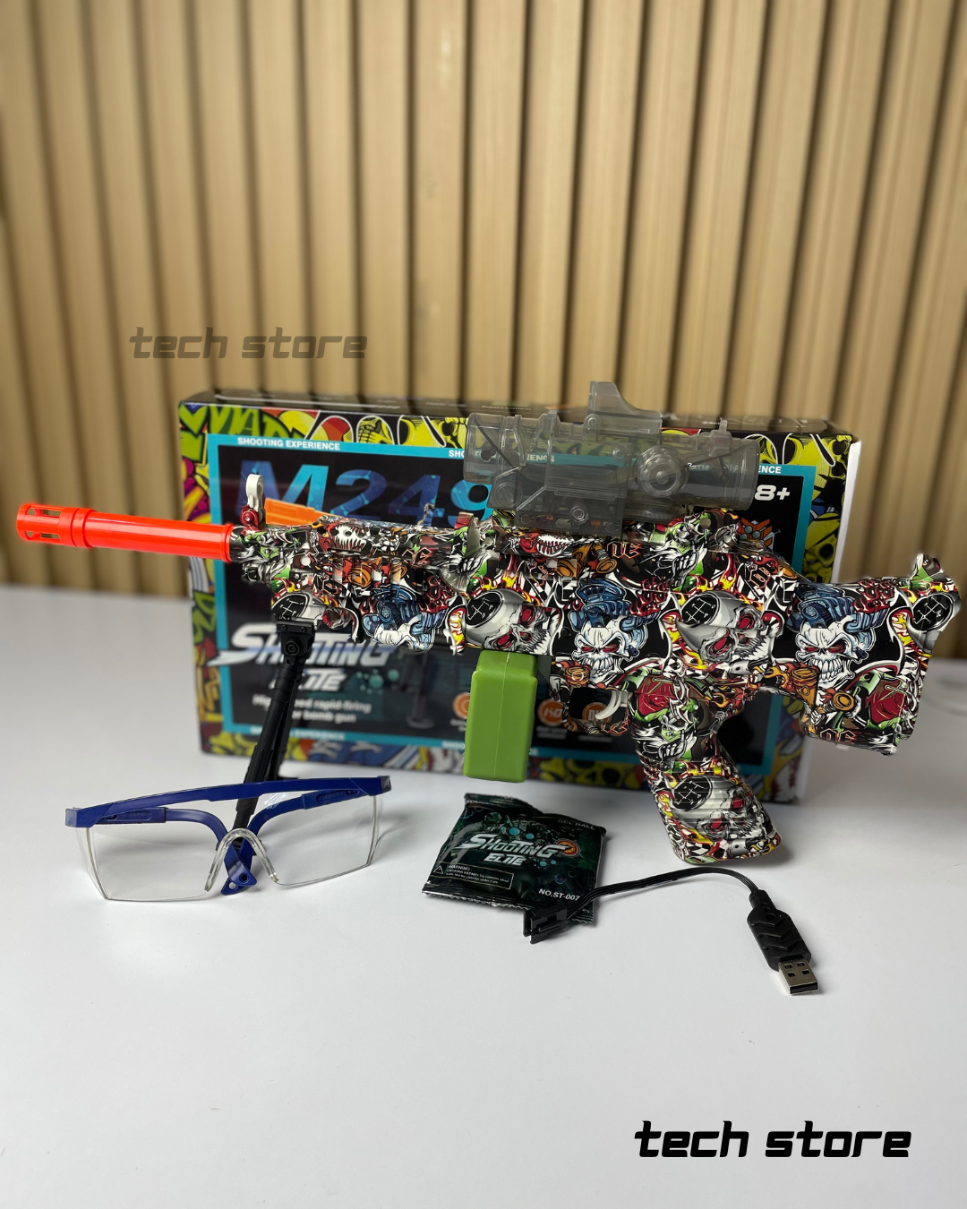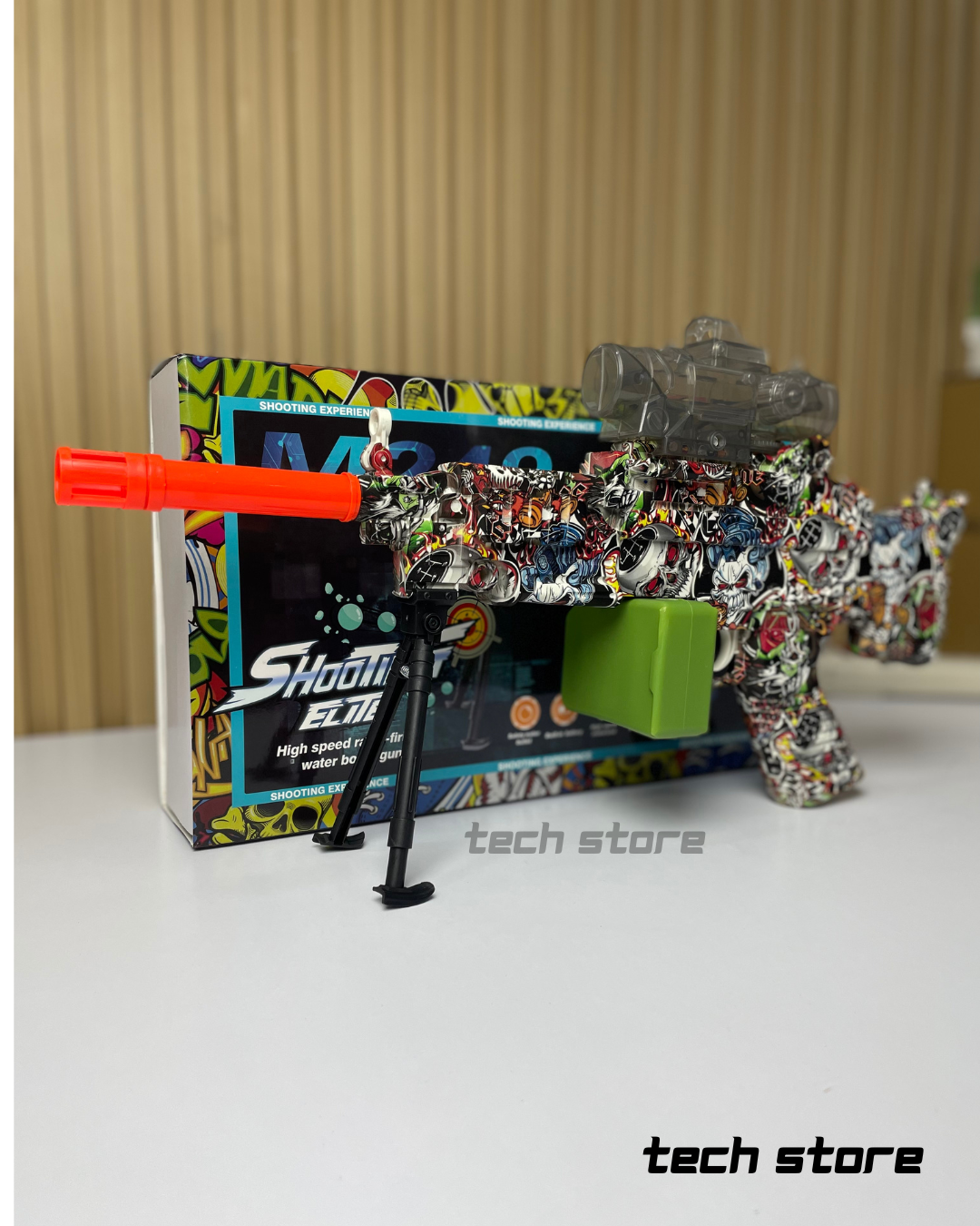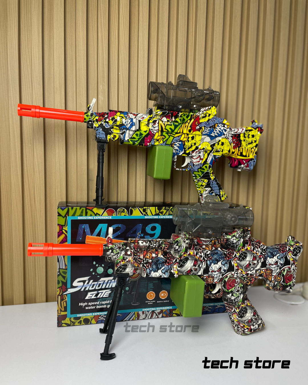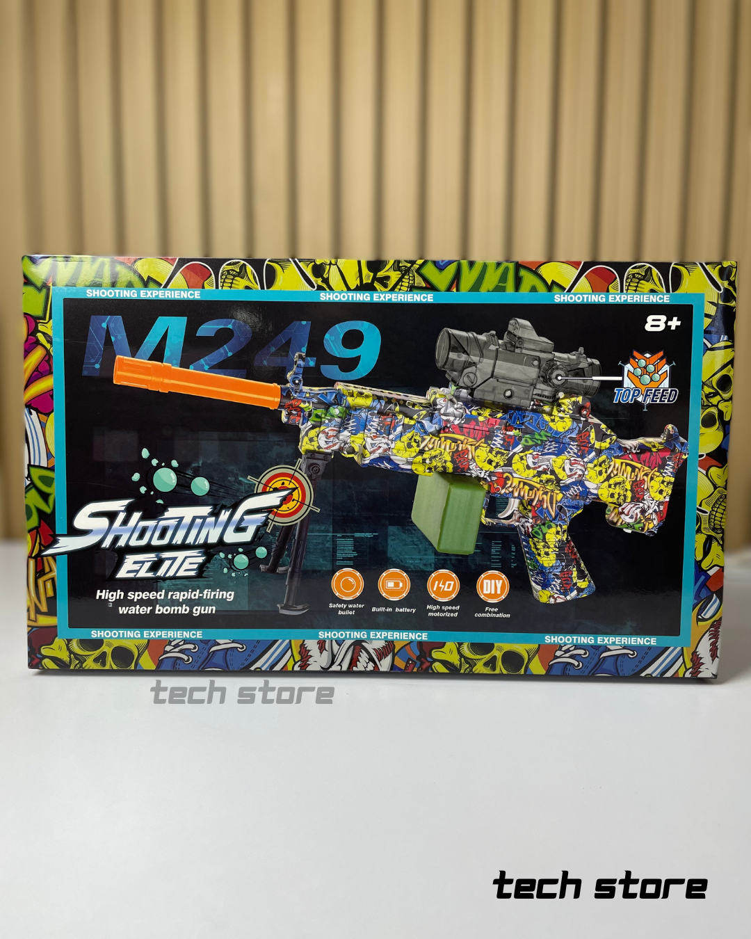El Shooting Elite M249 es un lanzador recreativo de “water bomb” o gel balls diseñado para usuarios infantiles a partir de los 8 años. Adopta una estética inspirada en el modelo M249, con un cuerpo de polímero ABS recubierto en gráficos multicolor tipo graffiti. Funciona mediante un sistema eléctrico interno que permite disparo rápido y continuo, alimentado por un depósito superior de gel balls y un cargador decorativo estilo caja (drum/caja de munición). Está orientado a juegos interactivos al aire libre, ofreciendo una experiencia de disparo segura gracias al uso de municiones hidratables de baja dureza.